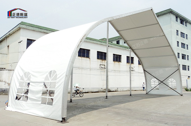 桃形篷房又常被称为弯柱篷房,以其独特的外形赢得广大客户的一致好评。桃形篷房主要采用单元组合式设计,跨度3-30米,长度可以按5m的倍数无限增加。此类篷房适用于各种大型会馆及运动场馆、网球馆及游泳池等。